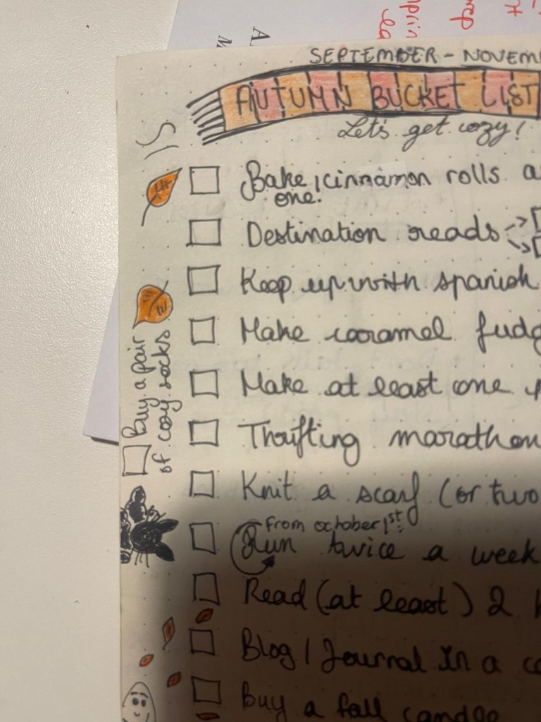Like I said, my reading journal also happens to be an amazing creative outlet. This year I decided to make a fall bucket list to make the most of the coming months and appreciate the magic of this season – even though it’s still so hot here in Malta…